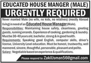 House Lahore, lahore Punjab Pakistan invites applications from eligible candidates for the post of male educated house manager as per advertisement of April 24, 2022 published in daily The News Newspaper. Candidates with Bachelor etc. educational background will be preferred.