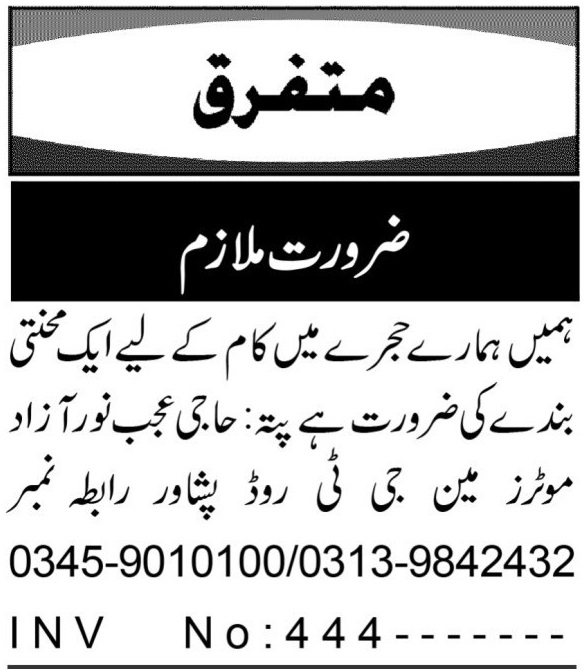 House is looking for candidates for following posts as per job advertisement published in daily Aaj Newspaper of September 19, 2025 for location GT Road Peshawar, peshawar Khyber Pakhtunkhwa KPK Pakistan:
