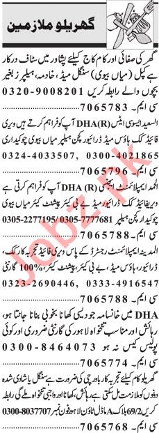 Experienced and strong personnel for the positions of House Maid, Helper, Driver, Kitchen Helper, Chowkidar, Security Guard, Cook required for a large House in Lahore.