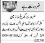 House Islamabad Pakistan invites applications from eligible candidates for the post of Patinet Care, Cook, Chowkidar, Driver, Helper, Office Boy and Aya as per advertisement of February 10, 2022 published in daily Dunya Newspaper. Primary and Middle etc. educational qualification will be preferred.