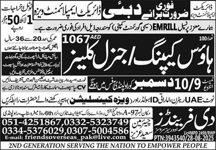The Friends Overseas Service invites applications for job positions advertised in daily Express dated 5 December 2025 for following vacancies in Dubai, abu dhabi Dubai.