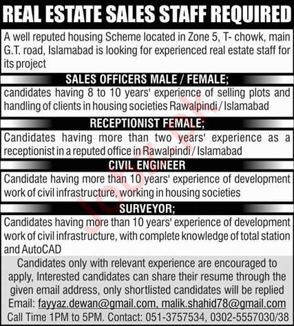 Housing Scheme jobs advertisement dated about 22 October 2023 in daily Express Newspaper invites application for the vacant post of civil engineer, receptionist, surveyor and sales officers in Islamabad, islamabad Islamabad Pakistan. Persons with DAE, Master and Bachelor etc. education can apply.