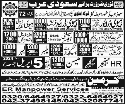 ER Manpower Services Dammam, jeddah Saudi Arabia invites applications from eligible candidates for the post of hr manager, plumber, industrial electrician, driver, labor, mason, heavy driver, safety officer, htv driver, site concrete foreman, concrete quality control manager, concrete pump operator and heavy diesel mechanic as per advertisement of April 2, 2024 published in daily Express Newspaper. Candidates with Intermediate, Matric, DAE, B.E and Bachelor etc. educational background will be preferred.
