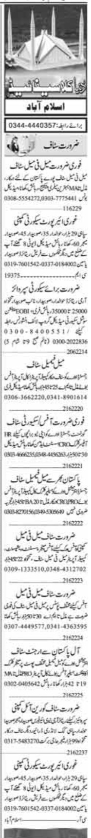 Vacant posts including security guard, office manager, office boy, clerk, computer operator, assistant, hr officer, cook, driver, havaldar, sepoy, office staff, assistant admin, accountant, receptionist, ltv driver, call computer operator, public relation officer, subedar, call operator, customer relationship officer, naib subedar, helper and pro are announced in Private Company Islamabad, islamabad Islamabad Pakistan as per 21 June 2022 advertisement in daily Dunya Newspaper. Preferred Education is Bachelor, Intermediate, Matric and Middle etc.