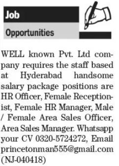 Private Company Hyderabad Sindh Pakistan invites applications from eligible candidates for the post of hr officer, area sales manager, female receptionist, hr manager and receptionist as per advertisement of February 11, 2022 published in daily The News Newspaper. Persons with Intermediate and Bachelor etc. education can apply.