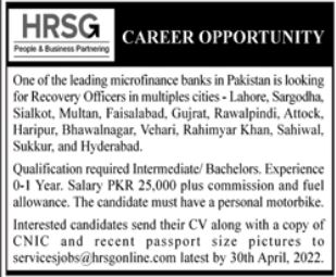 Vacant posts including recovery officer are announced in HRSG Outsourcing Pvt Limited Lahore, vehari, lahore, rawalpindi, sialkot, attock, bahawalnagar, hyderabad, multan, rahim yar khan, gujrat, haripur, sahiwal, sukkur and faisalabad Punjab Pakistan as per 24 April 2022 advertisement in daily Jang Newspaper. Persons with Intermediate and Bachelor etc. education can apply.