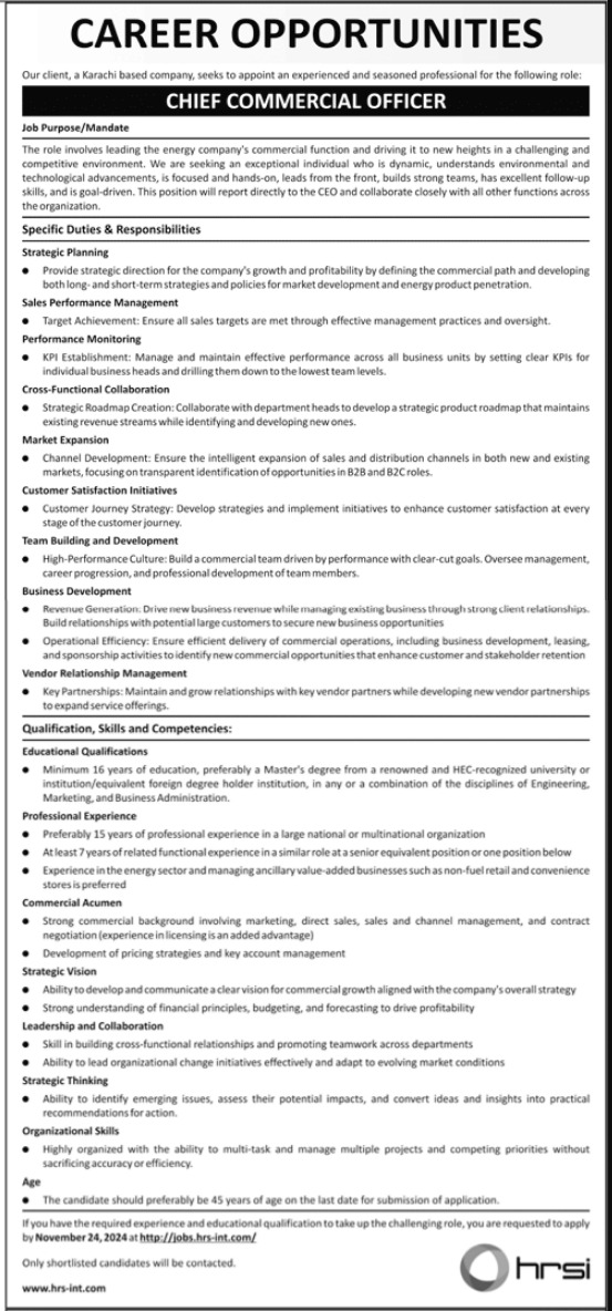 Vacant posts including chief commercial officer are announced in Human Resource Solution International HRSI Karachi, karachi Sindh Pakistan as per 10 November 2024 advertisement in daily Jang Newspaper. Candidates with Bachelor and Master etc. educational background will be preferred.