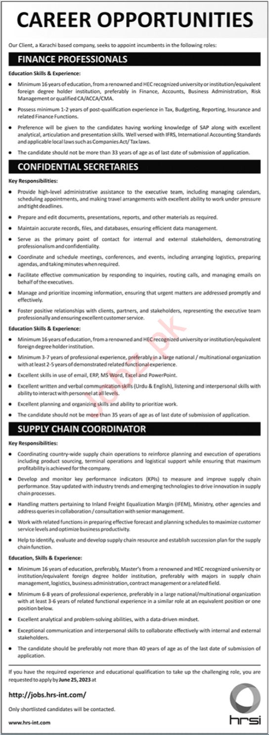 Vacant posts including confidential secretaries, supply chain coordinator and finance professionals are announced in Human Resource Solution International HRSI Lahore, lahore Punjab Pakistan as per 11 June 2023 advertisement in daily Jang Newspaper. Persons with Master and Bachelor etc. education can apply.