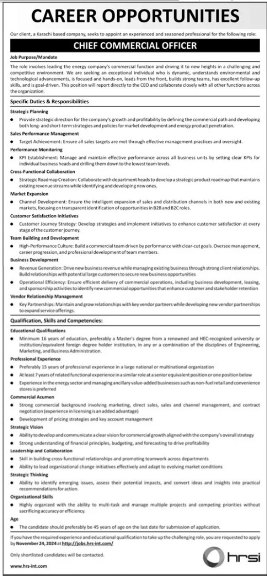 Human Resource Solution International HRSI jobs advertisement dated about 10 November 2024 in daily Jang Newspaper invites application for the vacant post of chief commercial officer in Karachi, karachi Sindh Pakistan. Educational qualifications required Master etc.