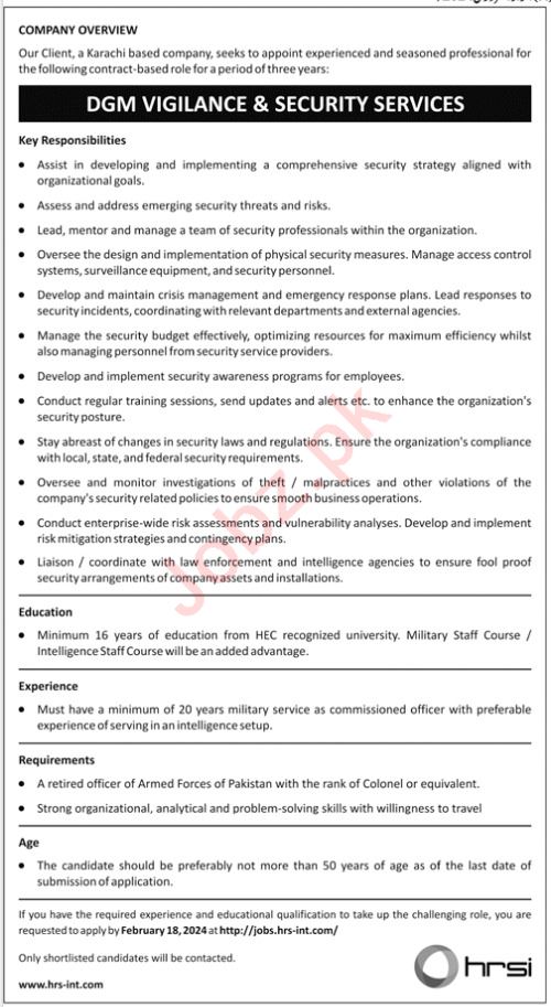 Human Resource Solution International HRSI jobs advertisement dated about 4 February 2024 in daily Jang Newspaper invites application for the vacant post of dgm vigilance security services in Karachi, karachi Sindh Pakistan. Candidates with Master and Bachelor etc. educational background will be preferred.