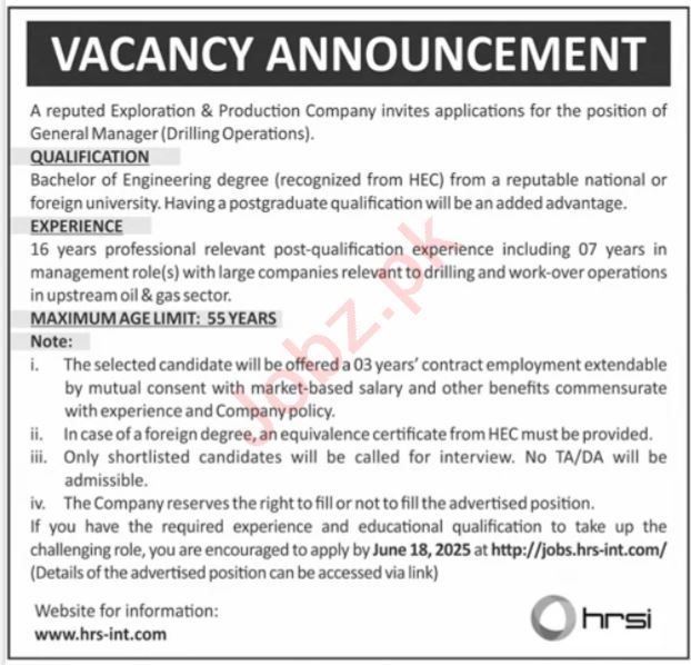 Human Resource Solution International HRSI is looking for candidates for following posts as per job advertisement published in daily Jang Newspaper of June 1, 2025 for location Clifton Karachi, karachi Sindh Pakistan: