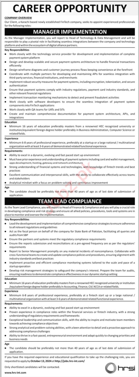 Human Resource Solution International HRSI Karachi, karachi Sindh Pakistan invites applications from eligible candidates for the post of manager implementation and team lead compliance as per advertisement of September 30, 2024 published in daily Jang Newspaper. Persons with Bachelor, MS and Master etc. education can apply.