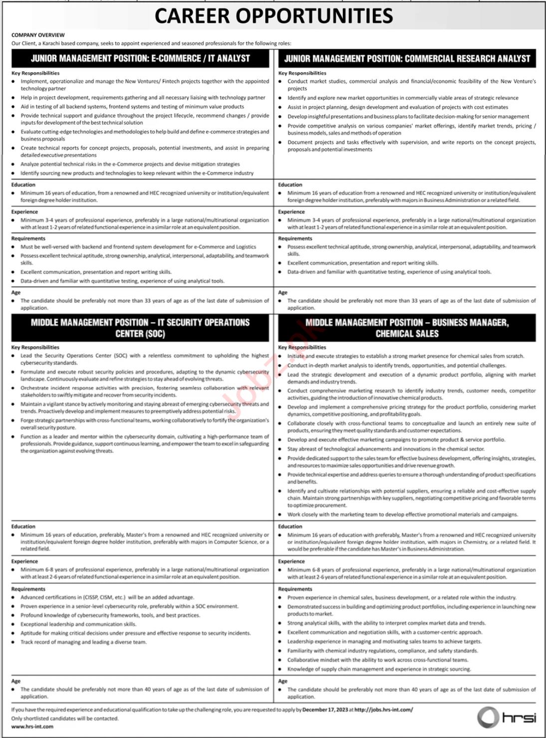 Vacant posts including it security operations centre sdc, e commerce manager, commercial research analyst, business manager chemical sales and it analyst are announced in Human Resource Solution International HRSI Karachi, karachi Sindh Pakistan as per 3 December 2023 advertisement in daily Jang Newspaper. Preferred Education is Master and Bachelor etc.