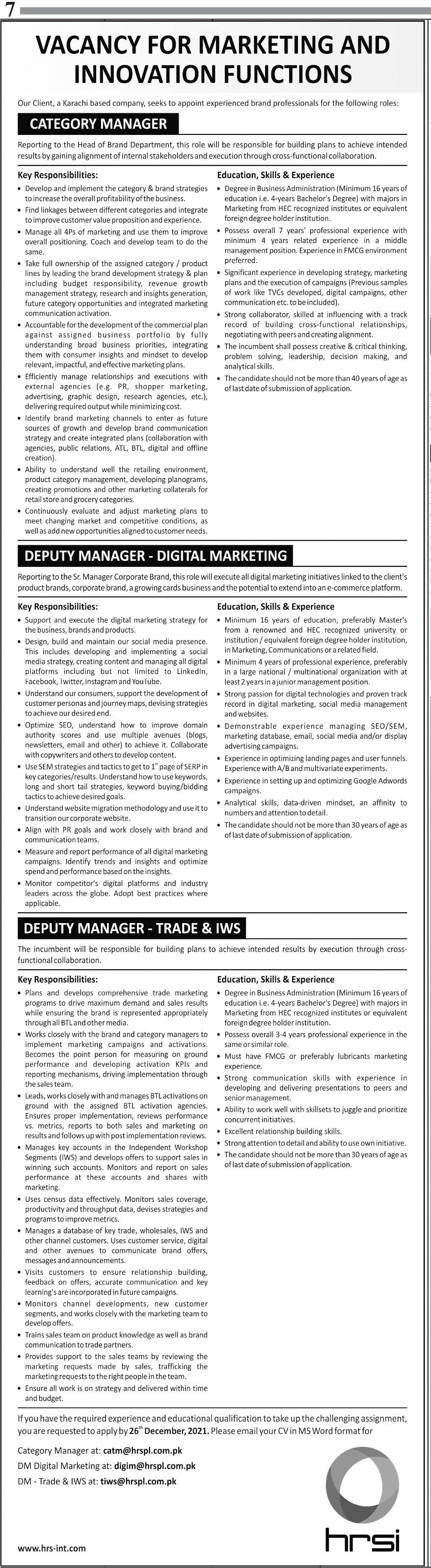 Vacancies in Human Resource Solution International HRSI Advertisement December 2021