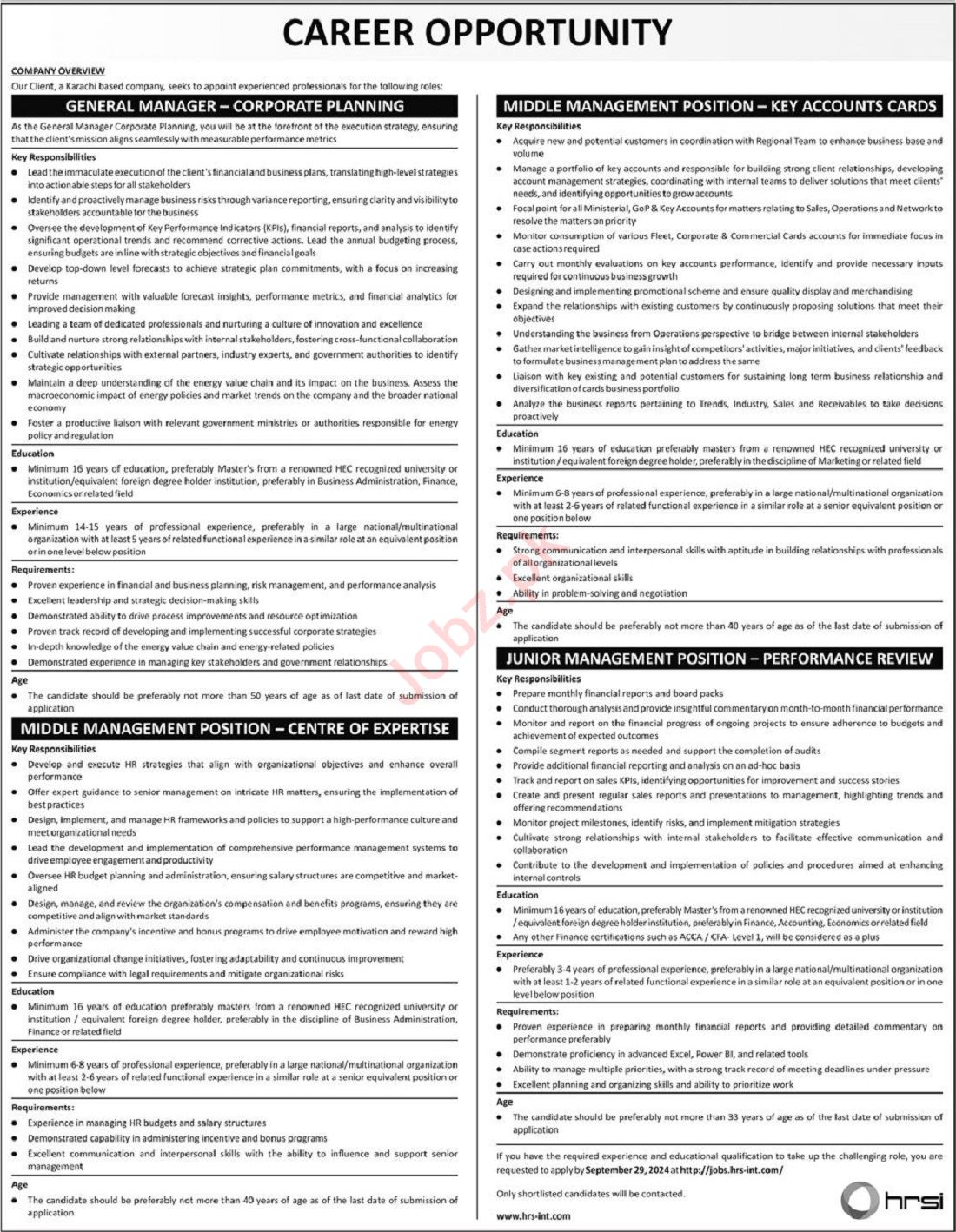Human Resource Solution International HRSI jobs advertisement dated about 15 September 2024 in daily Jang Newspaper invites application for the vacant post of middle management and general manager corporate planning in Karachi, karachi Sindh Pakistan. Educational qualifications required Master and Bachelor etc.