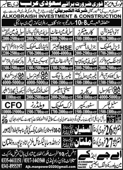 AJ&K Manpower Recruiting Agency Riyadh, dammam Saudi Arabia invites applications from eligible candidates for the post of operator asphalt pavement machine, welder, truck mechanic, hse engineer, general draftsman, civil foreman asphalt, bobcat operator, auto electrician, logistic supervisor, carpenter, civil foreman, land surveyor, qc engineer civil, mechanic foreman workshop, chief financial officer, plumber piping, steel fixer, ac engineer mechanical, qa engineer civil, qa engineer, small compactor operator, qc engineer mechanical, hydraulic mechanic, civil foreman infra pipeline, roller compactor operator, plumber main whole, cfo, store keeper, qc engineer and diesel mechanic as per advertisement of February 25, 2025 published in daily Express Newspaper. Preferred Education is Matric, Bachelor, BBA, DAE, Intermediate, B.E and B.com etc.