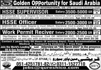Qureshi Manpower Bureau invites applications for job positions advertised in daily Express dated 4 March 2025 for following vacancies in Riyadh, dammam Saudi Arabia.