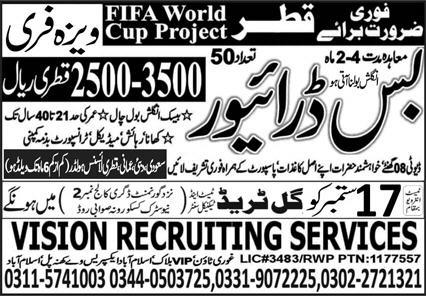 Vision Recruiting Services jobs advertisement dated about 16 September 2022 in daily Express Newspaper invites application for the vacant post of bus driver, driver and htv driver in Qatar, qatar Qatar. Candidates with Intermediate and Matric etc. educational background will be preferred.