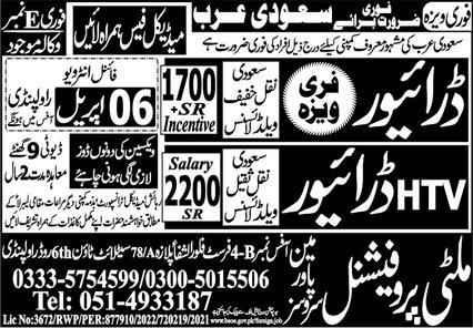 Multi Professional Manpower Services latest Overseas Driving jobs and others can be applied till 6 April 2022 or as per closing date in newspaper ad. Read complete ad online to know how to apply on latest Multi Professional Manpower Services job opportunities. Salary varies from 110000. Overtime is allowed. During job medical, transport and accommodation facility is available.