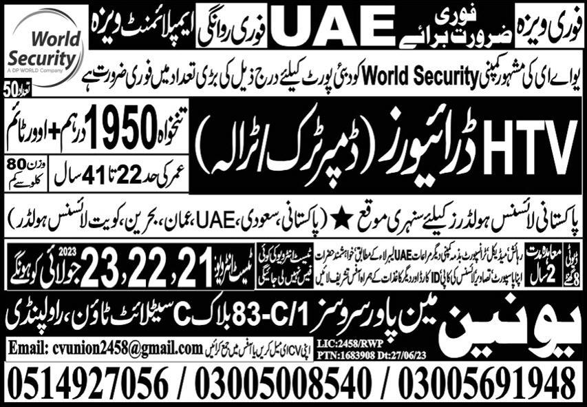 Vacant posts including truck driver, driver, traila driver, dumper driver and htv driver are announced in Union Manpower Services Sharjah, abu dhabi UAE as per 20 July 2023 advertisement in daily Express Newspaper. Educational qualifications required Intermediate and Matric etc.