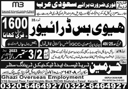 Harmain Trade Test & Technical Training Center jobs advertisement dated about 25 August 2023 in daily Express Newspaper invites application for the vacant post of driver, heavy bus driver, htv driver and bus driver in Dammam, riyadh Saudi Arabia. Persons with Matric and Intermediate etc. education can apply.