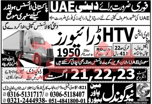 Vacant posts including htv drivers are announced in New Gondal Manpower Bureau Dammam, dammam Saudi Arabia as per 20 August 2023 advertisement in daily Mashriq Newspaper. Persons with Matric and Middle etc. education can apply.