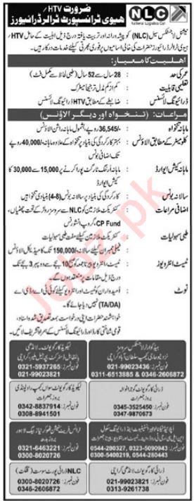 Vacant posts including heavy transport tralar driver and htv driver are announced in National Logistics Cell NLC Rawalpindi, gilgit, lahore, gujranwala, karachi and rawalpindi Punjab Pakistan as per 13 August 2023 advertisement in daily Ausaf Newspaper. Candidates with Middle and Matric etc. educational background will be preferred.