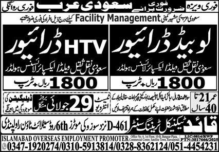 Vacant posts including htv driver, driver and low bed driver are announced in Quaid Technical Training Center Jeddah, dammam Saudi Arabia as per 26 July 2025 advertisement in daily Express Newspaper. Educational qualifications required Intermediate and Matric etc.