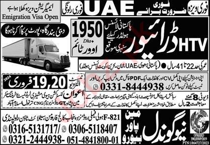 Vacant posts including htv driver are announced in New Gondal Manpower Bureau Abu Dhabi, abu dhabi UAE as per 18 February 2024 advertisement in daily Express Newspaper. Persons with Middle and Matric etc. education can apply.