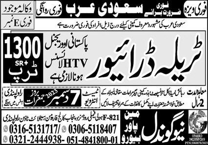 New Gondal Manpower Bureau Jeddah, dammam Saudi Arabia invites applications from eligible candidates for the post of traila driver, htv driver and driver as per advertisement of December 6, 2023 published in daily Express Newspaper. Educational qualifications required Intermediate and Matric etc.