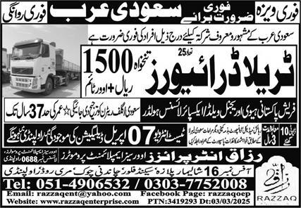 Vacant posts including traila driver, htv driver and driver are announced in Razzaq Enterprises Jeddah, taif Saudi Arabia as per 4 April 2025 advertisement in daily Express Newspaper. Matric and Intermediate etc. educational qualification will be preferred.
