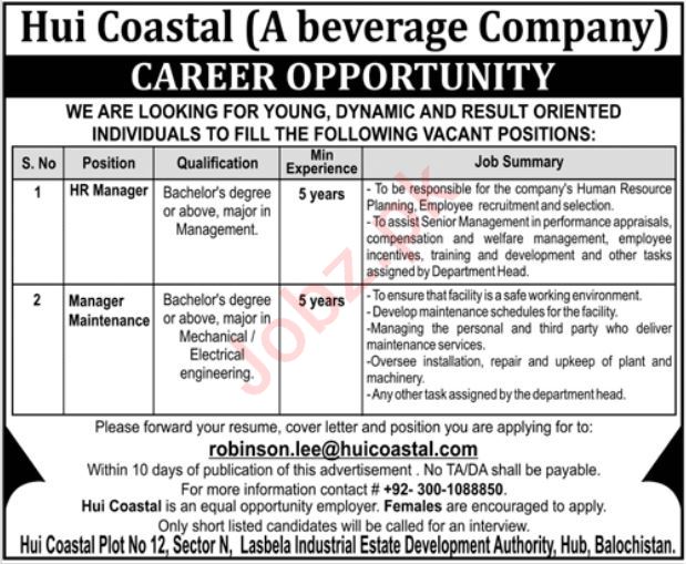 HUI Coastal jobs advertisement dated about 21 August 2022 in daily Jang Newspaper invites application for the vacant post of manager maintenance and hr manager in Hub, hub Balochistan Pakistan. Educational qualifications required Bachelor etc.