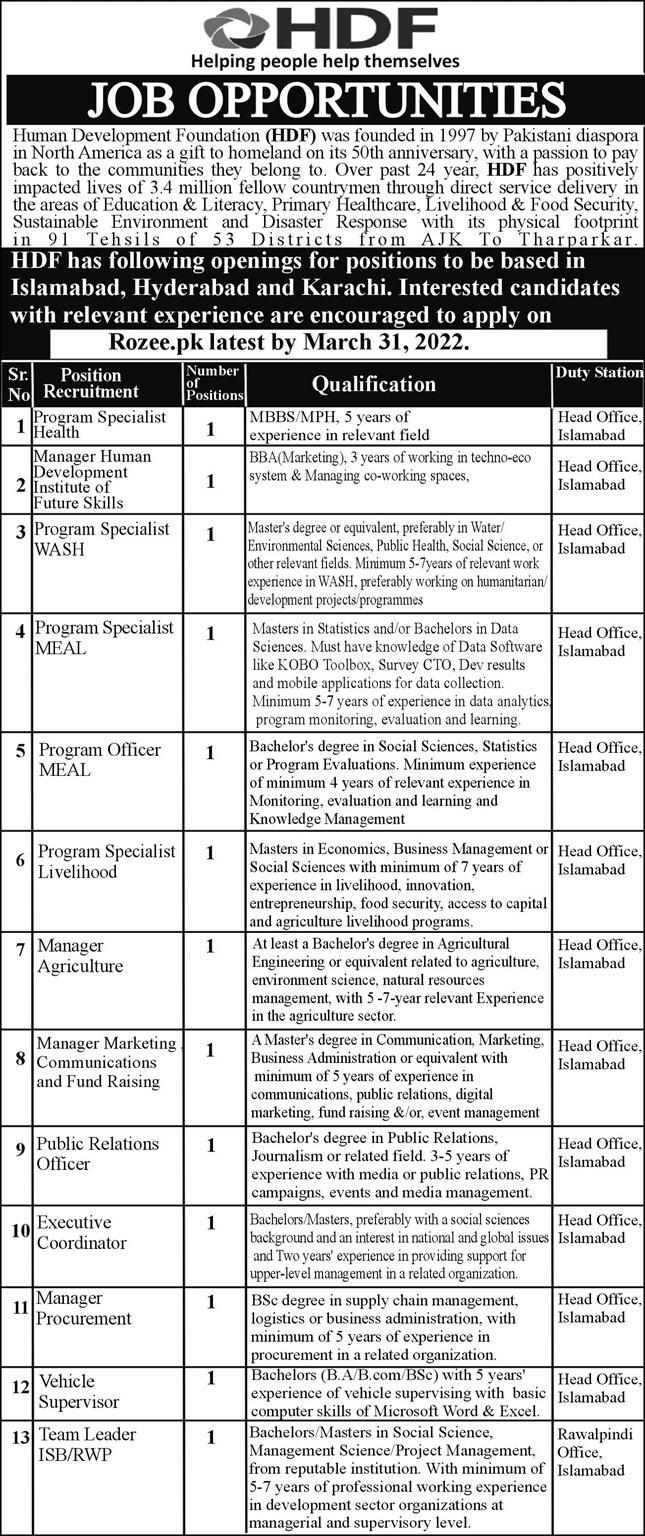 Apply at Human Development Foundation HDF latest Private jobs in Management and departments before closing date which is around March 31, 2022 or as per closing date in newspaper ad. Read complete ad online to know how to apply on latest Human Development Foundation HDF job opportunities.