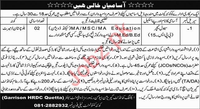 Latest Garrison Human Resource Development Center Teaching Posts Quetta 2025