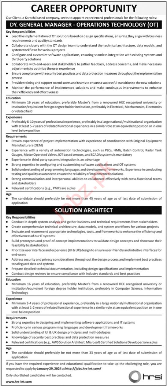 Vacant posts including deputy general manager and solution architect are announced in Human Resource Solution International HRSI Lahore, lahore Punjab Pakistan as per 14 January 2024 advertisement in daily Jang Newspaper. Persons with Master etc. education can apply.
