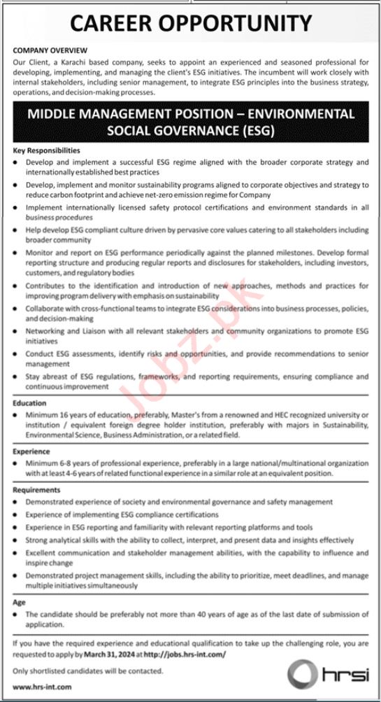 Vacant posts including environmental social governance and middle management positions are announced in Human Resource Solution International HRSI Karachi, karachi Sindh Pakistan as per 17 March 2024 advertisement in daily Jang Newspaper. Persons with Master and Bachelor etc. education can apply.