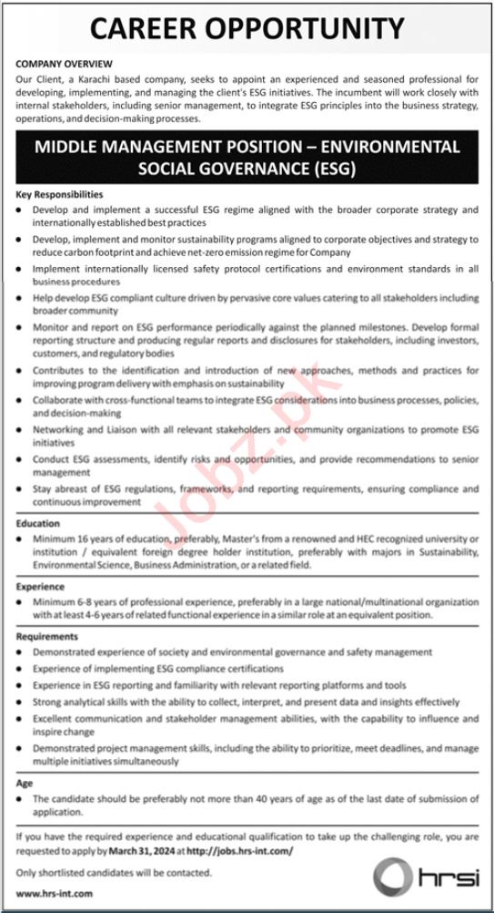 Human Resource Solution International HRSI invites applications for job positions advertised in daily Jang dated 17 March 2024 for following vacancies in Karachi, karachi Sindh Pakistan.