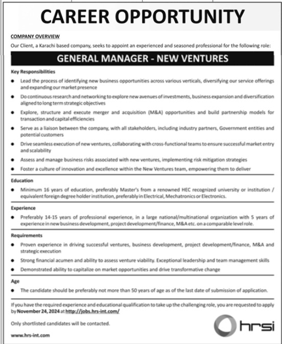 Human Resource Solutions International HRSI invites applications for job positions advertised in daily Jang dated 10 November 2024 for following vacancies in Karachi, karachi Sindh Pakistan.