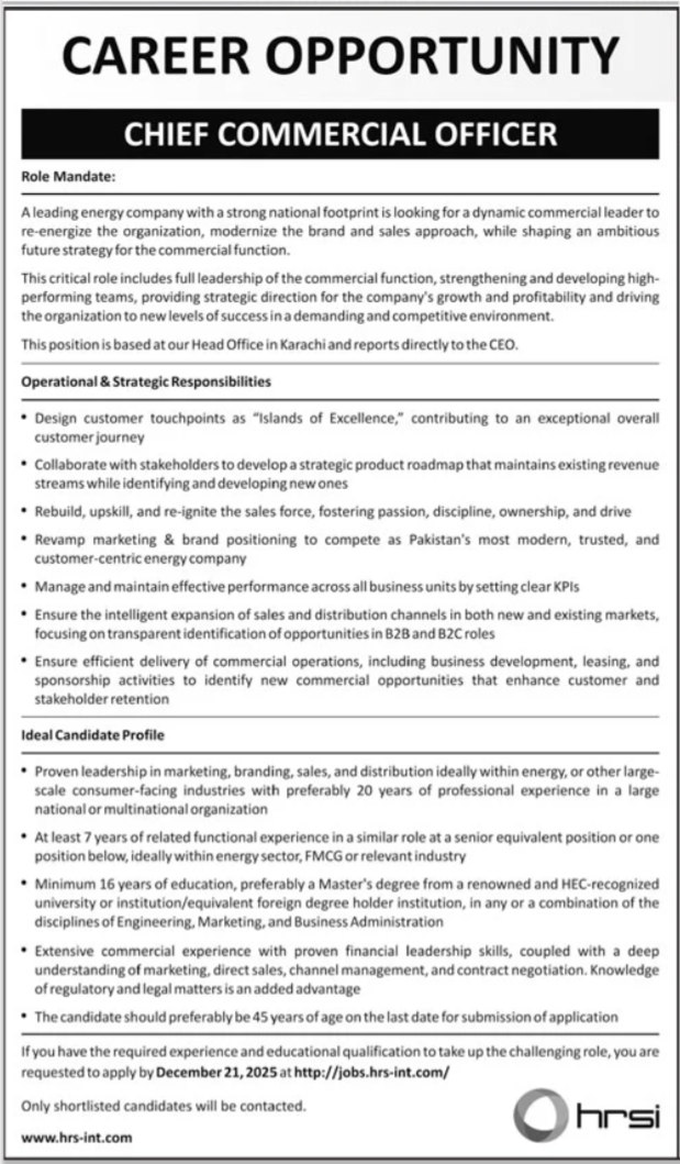 Human Resource Solutions International HRSI jobs advertisement dated about 7 December 2025 in daily Jang Newspaper invites application for the vacant post of chief commercial officer cfo in Karachi, karachi Sindh Pakistan. Preferred Education is Master, MS and Bachelor etc.