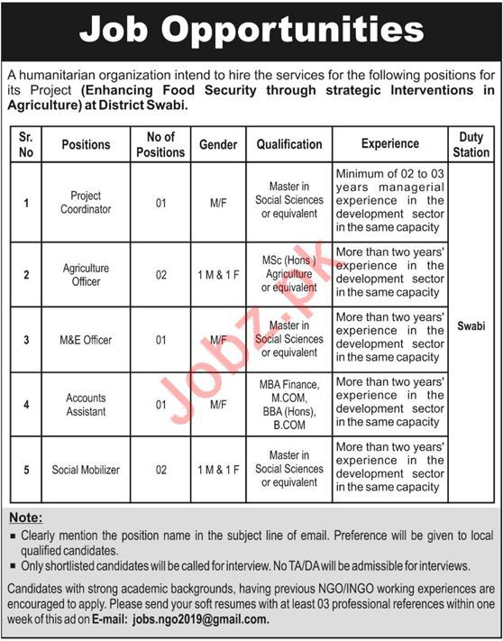 A Humanitarian Organization NGO intend to hire the services of qualified and experienced individuals for the positions of Project Coordinator, Agriculture Officer, Monitoring Officer, Evaluation Officer, Accounts Assistant, Social Mobilizer in District Swabi Khyber Pakhtunkhwa KPK 2020.