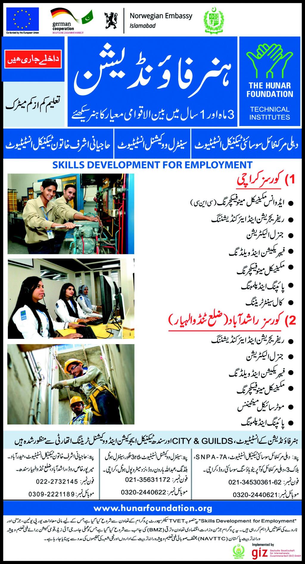 Hunar Foundation has announced admissions for courses in Advance Mechanical Manufacturing, Refrigeration & Air Conditioning, General Electrician, Fabrication & Welding, Mechanical Manufacturing, Piping & Plumbing, Call Center Training, Motorcycle Maintenance. Read newspaper ad for exact details.