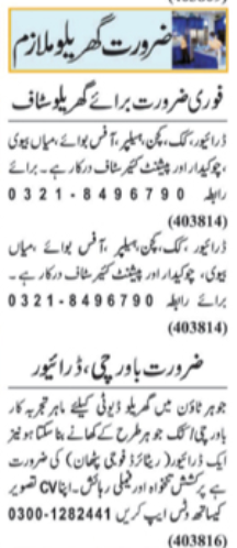 Vacant posts including chowkidar, bawarchi, house driver, office boy, cook, driver, ltv driver, husband wife, patient care and kitchen helper are announced in House Johar Town Lahore, lahore Punjab Pakistan as per 23 April 2025 advertisement in daily Nawaiwaqt Newspaper. Matric, Middle and Primary etc. educational qualification will be preferred.