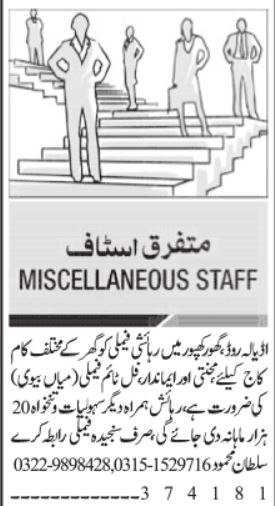 House jobs advertisement dated about 29 August 2023 in daily Jang Newspaper invites application for the vacant post of masi, aya, house maid, maid and husband wife in Rawalpindi, rawalpindi Punjab Pakistan. Preferred Education is Middle and Primary etc.