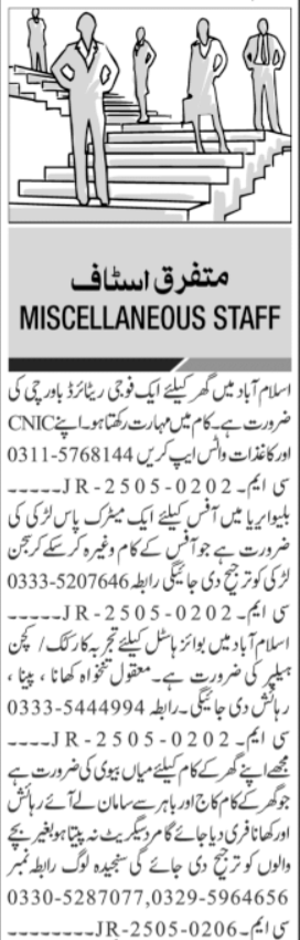 Private Company Blue Area Islamabad, islamabad Islamabad Pakistan invites applications from eligible candidates for the post of bawarchi, house worker, kitchen helper, husband wife, office staff and cook as per advertisement of May 7, 2025 published in daily Jang Newspaper. Persons with Matric, Middle, Primary and Intermediate etc. education can apply.