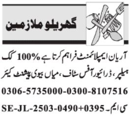 House Lahore, lahore Punjab Pakistan invites applications from eligible candidates for the post of patient care, helper, cook, driver, office staff and husband wife as per advertisement of March 15, 2025 published in daily Jang Newspaper. Persons with Primary, Matric and Middle etc. education can apply.