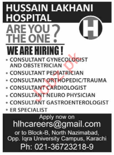 Hussain Lakhani Hospital Karachi, Pakistan is seeking for the services from experienced candidates for the posts of Consultant Gynecologist, Consultant Obstetrician, Consultant Pediatrician, Consultant Orthopedic, Consultant Trauma, Consultant Cardiologist, Consultant Neuro Physician, Consultant Gastroenterologist, ER Specialist.