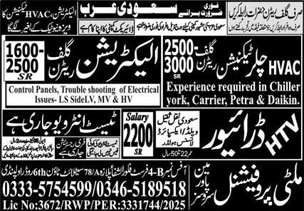 Multi Professional Manpower Services jobs advertisement dated about 19 June 2025 in daily Express Newspaper invites application for the vacant post of driver, hvac chiller technician, electrician and htv driver in Dammam, riyadh Saudi Arabia. Candidates with Intermediate, Matric, Bachelor and DAE etc. educational background will be preferred.