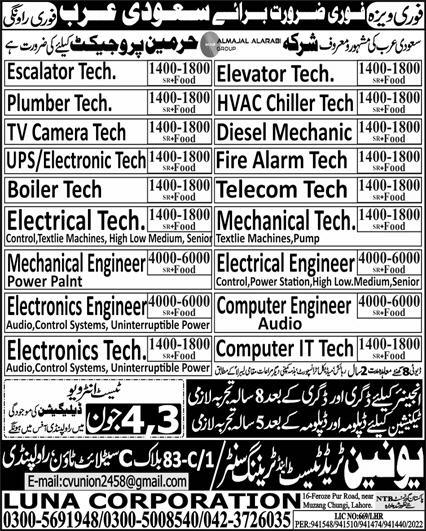 Union Trade Test and Training Center jobs advertisement dated about 3 June 2022 in daily Express Newspaper invites application for the vacant post of plumber technician, computer it technician, electronics engineer, mechanical engineer, electronic technician, boiler technician, escalator technician, fire alarm technician, electrical engineer, computer engineer, engineer, tv camera technician, elevator technician, ups technician, electrical technician, telecom technician, diesel mechanic, hvac chiller technician and mechanical technician in Dammam, dammam Saudi Arabia. Candidates with Bachelor, Matric, Middle and Intermediate etc. educational background will be preferred.