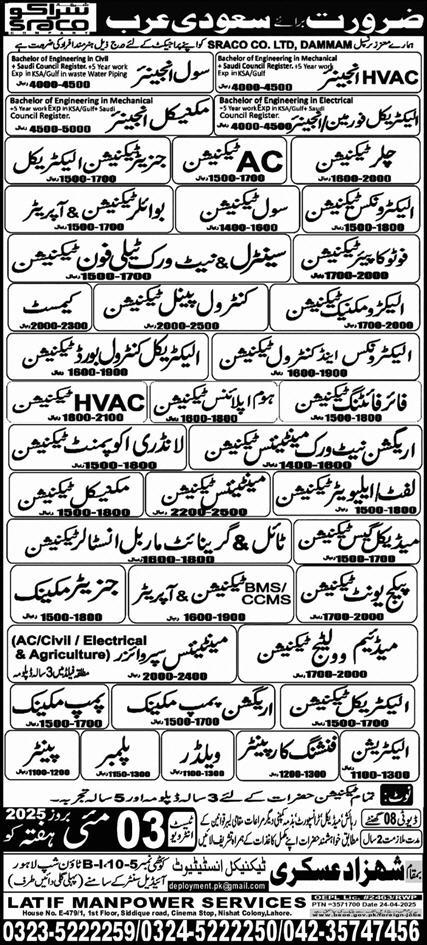 Vacant posts including civil technician, electrical foreman, ccms technician, boiler technician, pump mechanic, painter, mechanical engineer, hvac technician, civil engineer, irrigation pump mechanic, lift technician, maintenance technician, fire fighting technician, irrigation network technician, welder, chemist, central network technician, home appliances technician, irrigation network maintenance technician, ccms operator, medical gas technician, electrical technician, boiler operator, finishing carpenter, generator technician electrical, control panel technician, hvac engineer, elevator technician, electro mechanic technician, mechanical technician, medium voltage technician, granite marble technician, electrical control board technician, network telephone technician, bms operator, electrical engineer, ac technician, package unit technician, chiller technician, bms technician, maintenance supervisor, plumber, electronics technician, tile installer technician, electrician, generator mechanic, photocopier technician and laundry equipment technician are announced in Shahzad Askari Technical Institute Dammam, riyadh Saudi Arabia as per 30 April 2025 advertisement in daily Express Newspaper. Persons with B.E, Bachelor, Matric, Intermediate and DAE etc. education can apply.