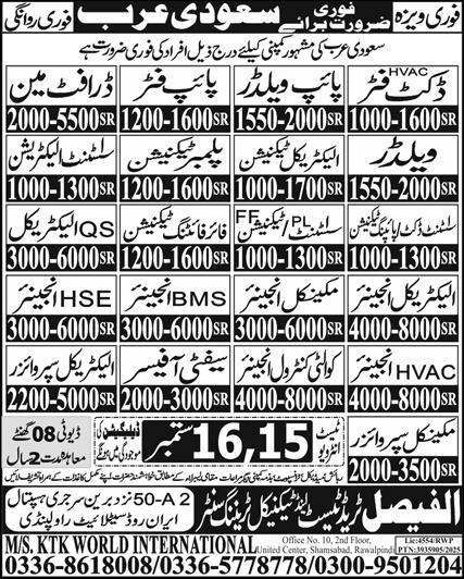 Al Faisal Trade Test & Technical Training Center latest Overseas Industrial jobs and others can be applied till September 16, 2025 or as per closing date in newspaper ad. Read complete ad online to know how to apply on latest Al Faisal Trade Test & Technical Training Center job opportunities. Salary varies from 603000.